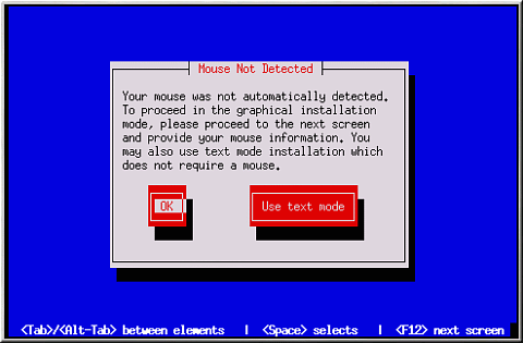 You can choose to continue with the GUI installation or use the text mode installation, which does not require using a mouse. If you choose to continue with the GUI installation, you must provide the installation program with your mouse configuration information (refer to Section 4.14 Mouse Configuration).