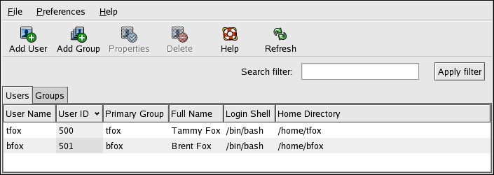 Red Hat Enterprise Linux reserves user IDs below 500 for system users. By default, User Manager does not display system users. To view all users, including the system users, uncheck Preferences => Filter system users and groups from the pulldown menu.
