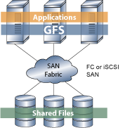 You can deploy GFS in a variety of configurations to suit your needs for performance, scalability, and economy. For superior performance and scalability, you can deploy GFS in a cluster that is connected directly to a SAN. For more economical needs, you can deploy GFS in a cluster that is connected to a LAN with servers that use GNBD (Global Network Block Device). A GNBD provides block-level storage access over an Ethernet LAN. (For more information about GNBD, refer to Chapter 11 Using GNBD.)