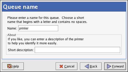In the window shown in Figure 36-3, enter a unique name for the printer in the Name text field. The printer name cannot contain spaces and must begin with a letter. The printer name may contain letters, numbers, dashes (-), and underscores (_). Optionally, enter a short description for the printer, which can contain spaces.