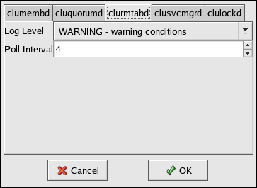 Log Level — Determines the level of event messages that get logged to the cluster log file (by default /var/log/messages). Choose the appropriate logging level from the menu. Refer to Section 3.12 Configuring syslogd Event Logging for more information.
