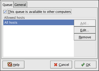 After selecting to share the queue, by default, all hosts are allowed to print to the shared printer. Allowing all systems on the network to print to the queue can be dangerous, especially if the system is directly connected to the Internet. It is recommended that this option be changed by selecting the All hosts entry and clicking the Edit button to display the window shown in Figure 24-18.