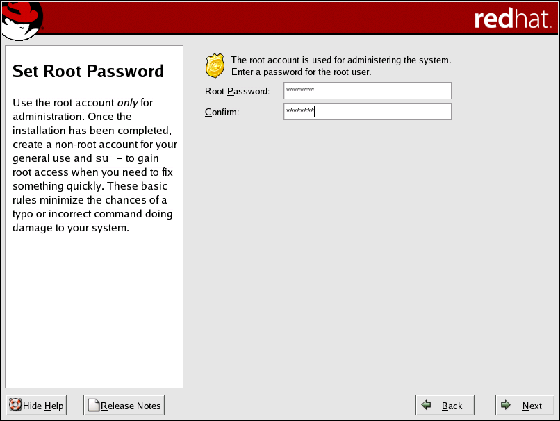 The root password must be at least six characters long; the password you type is not echoed to the screen. You must enter the password twice; if the two passwords do not match, the installation program asks you to enter them again.