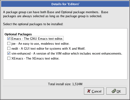 You can select package groups, which group components together according to function (for example, X Window System and Editors), individual packages, or a combination of the two.