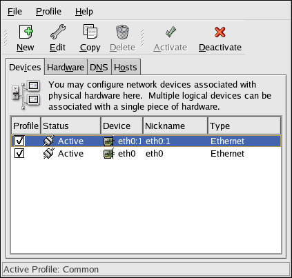 Figure 8-18 shows an example of one alias for the eth0 device. Notice the eth0:1 device — the first alias for eth0. The second alias for eth0 would have the device name eth0:2, and so on. To modify the settings for the device alias, such as whether to activate it at boot time and the alias number, select it from the list and click the Edit button.