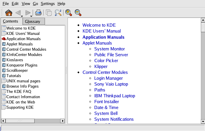 The opening screen of the HelpCenter browser appears like Figure A-19. From this main page, you can view help documentation on topics such as using and configuring the desktop, working with the many applications included with KDE, and working with the Konquerer file manager.
