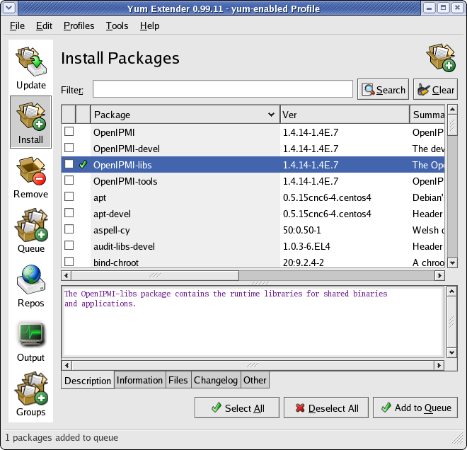 To install a new package click on the Install button on the left side of Yum Extender. You will see a list of packages that are available for installation on your system. You can select the packages you wish to install by selecting the check box and add them to the Yum Extender Queue by pressing the Add to Queue button. There are also Select all and Deselect All buttons to help with package selection. Once a package is selected and moved to the Queue, there will be a Green check mark beside that package.