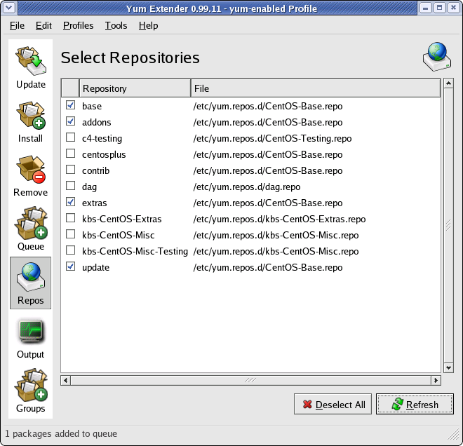 To enter this section, you would press the Repos button on the left side of Yum Extender. Yum repositories that are already included in your /etc/yum.repos.d/ directory or in your /etc/yum.conf and enabled will be checked. Repositories in those above locations that are disabled will be unchecked. You may check or uncheck repositories and then use the Refresh button to recalculate the package information.