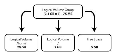 The logical volume group is divided into logical volumes, which are assigned mount points, such as /home and /m and file system types, such as ext2 or ext3. When "partitions" reach their full capacity, free space from the logical volume group can be added to the logical volume to increase the size of the partition. When a new hard drive is added to the system, it can be added to the logical volume group, and partitions that are logical volumes can be expanded.