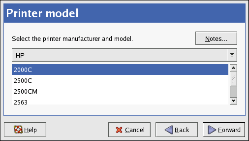 A window similar to Figure 34-10 appears. If it was not auto-detected, select the model from the list. The printers are divided by manufacturers. Select the name of the printer manufacturer from the pulldown menu. The printer models are updated each time a different manufacturer is selected. Select the printer model from the list.